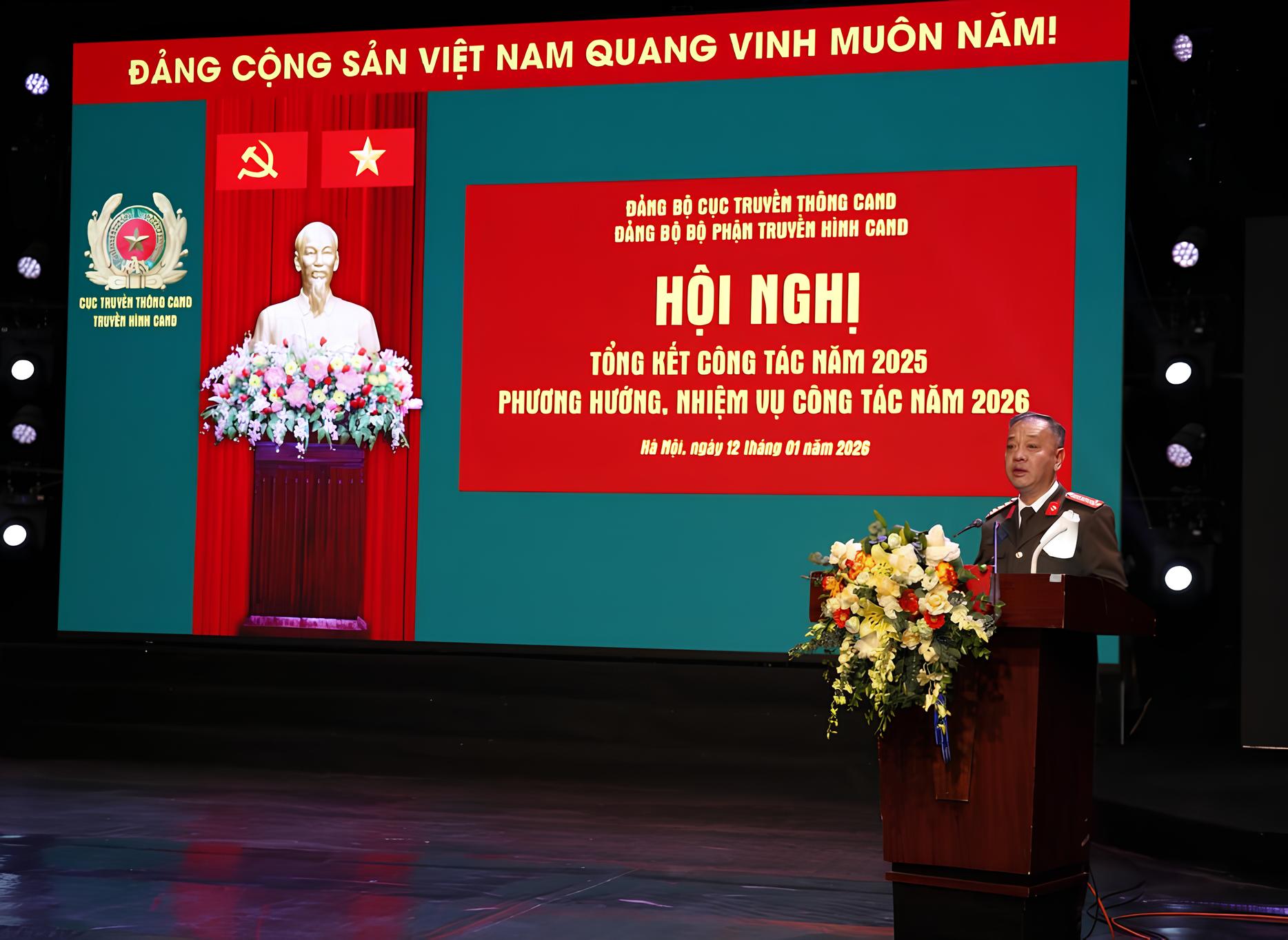 Phát biểu chỉ đạo tại hội nghị, Thiếu tướng Đỗ Triệu Phong, Bí thư Đảng ủy, Cục trưởng Cục Truyền thông CAND ghi nhận và biểu dương những thành tích mà Truyền hình CAND đạt được trong năm 2025. Đặc biệt, đồng chí đánh giá cao tinh thần dấn thân, không ngại gian khổ của đội ngũ phóng viên tại các điểm nóng, vùng bão lũ và hiện trường nguy hiểm. Sự nỗ lực và quyết tâm ấy không chỉ khẳng định bản lĩnh của người làm báo trong lực lượng CAND mà còn góp phần quan trọng vào nhiệm vụ tuyên truyền, định hướng dư luận một cách hiệu quả và nhân văn.