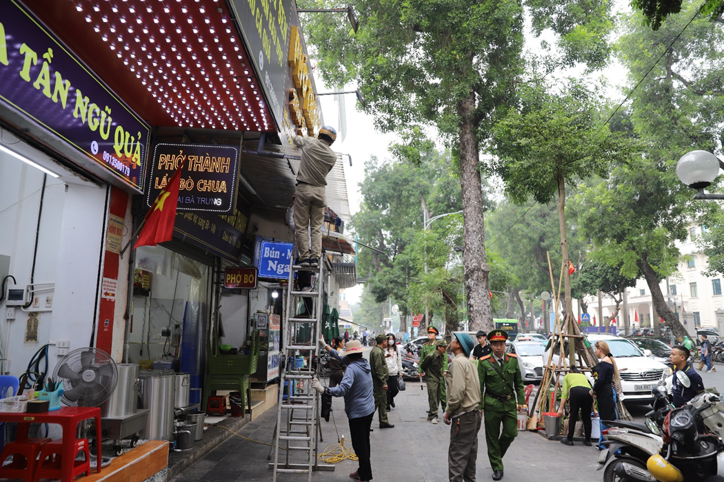 Trung tá Phan An, Tổ trưởng Tổ Cảnh sát trật tự, Công an phường Cửa Nam cho biết: “Trong lần làm thí điểm này, chúng tôi áp dụng thêm một số biện pháp mới. Chúng tôi tuyên truyền bằng 4 hình thức, qua truyền thông đại chúng, chúng tôi thông tin tới người dân việc phải tự ý thức sắp xếp để thành phố xanh, sạch, đẹp. Thứ 2, qua loa truyền thanh của phường và loa chuyên dụng, chúng tôi có nhắc nhở người dân trong việc ý thức chấp hành các quy định. Thứ 3, qua các trang mạng xã hội, Fanpage, Zalo, Facebook, chúng tôi tuyên truyền người dân về việc làm mẫu phường văn minh đô thị. Thứ tư, trực quan, qua các pano, tài liệu, ký các bản cam kết trực tiếp với các cơ sở.”